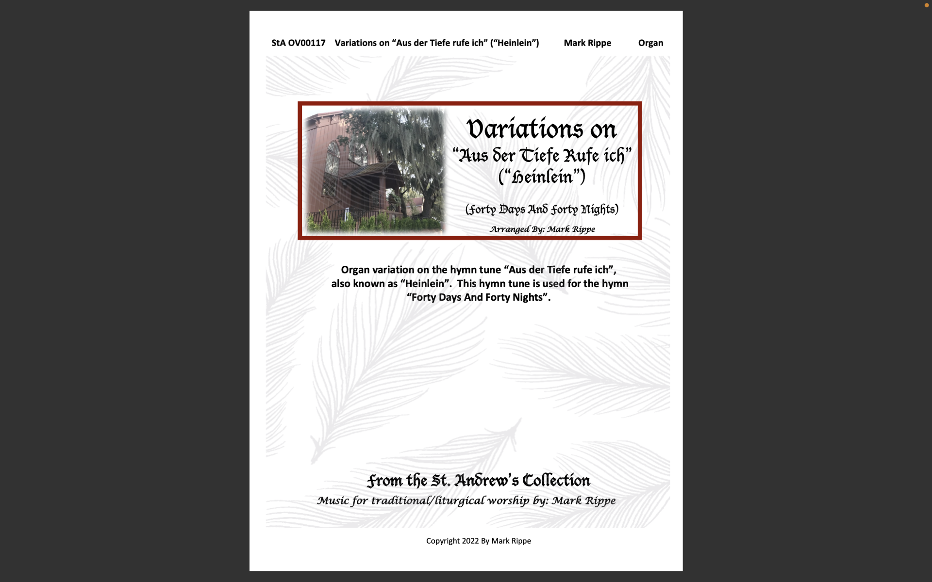 StA OV00117. Organ variation of the hymn tune “Austria Der Tiefe rufe ich”, also known as “Heinlein”. Particularly appropriate during Lent, this hymn tune is used for the hymn “Forty Days And Forty Nights”.