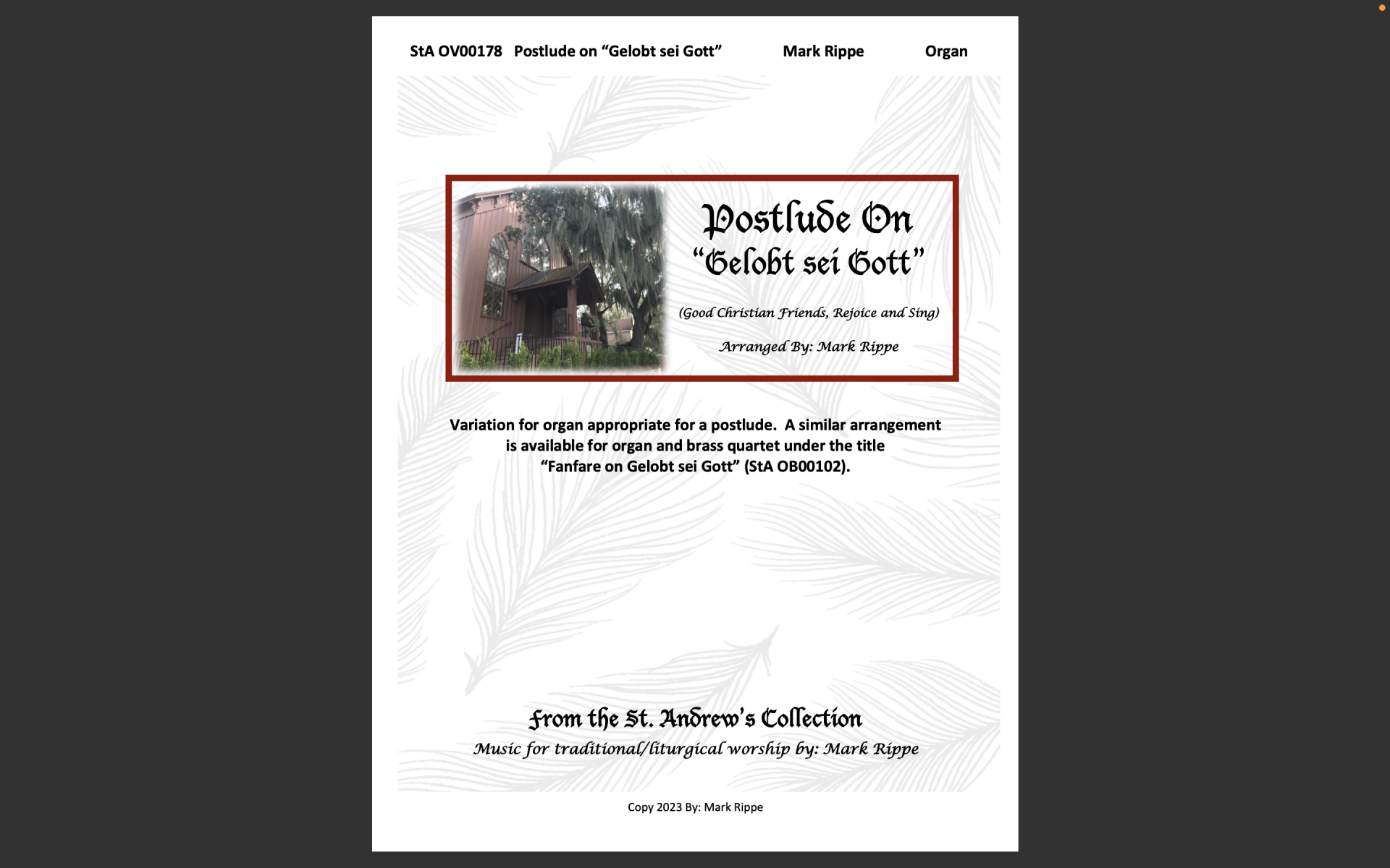 StA OV00178. Variation appropriate for a postlude. Use anytime, but especially during Christmas. A similar arrangement is available for organ and brass quartet under the title “Fanfare on Gelobt sei Gott” (StA OB00102).