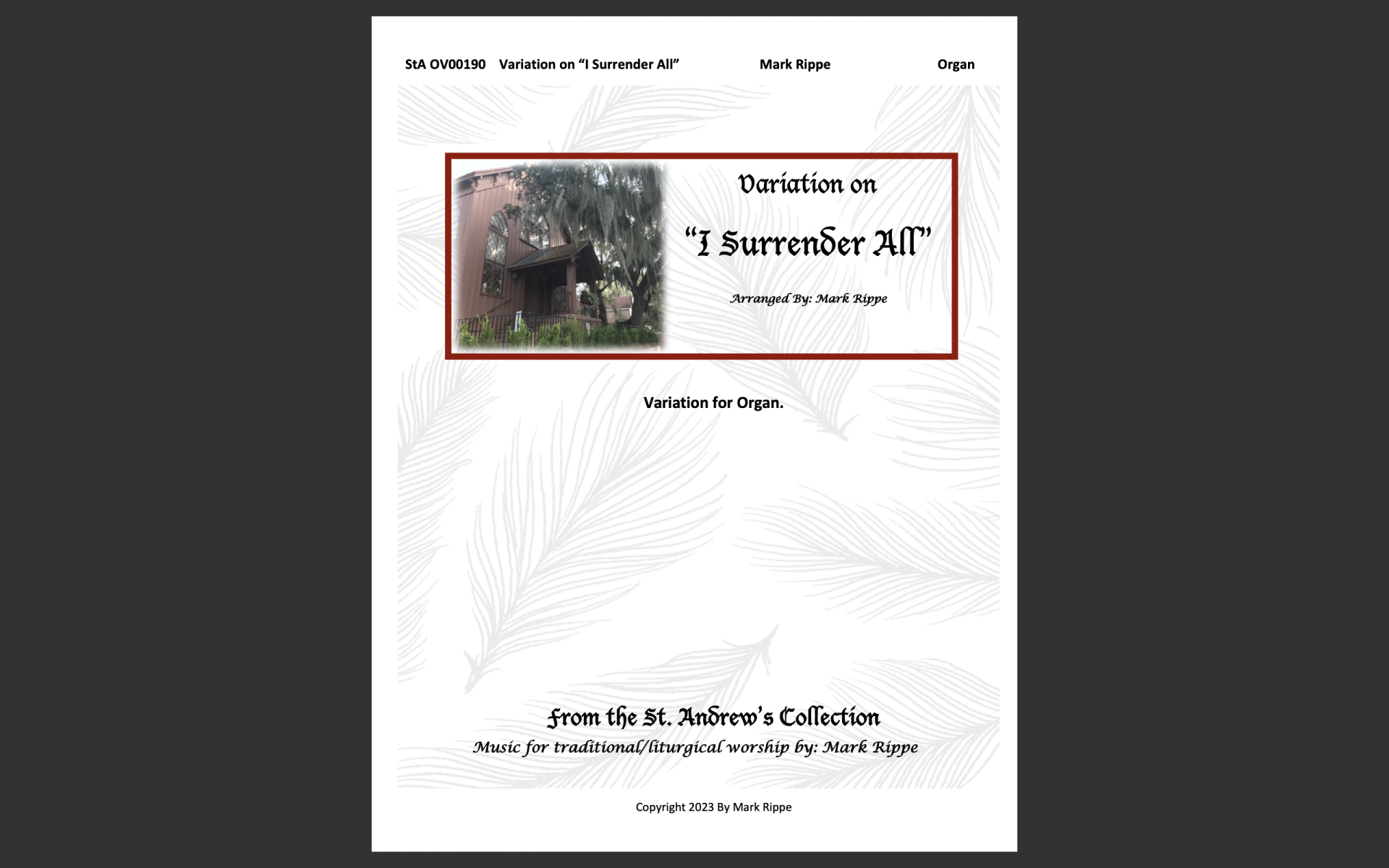 StA OV00190. Variation for organ. A similar arrangement is available for SATB choir with soprano solo and organ accompaniment (StA C00153).