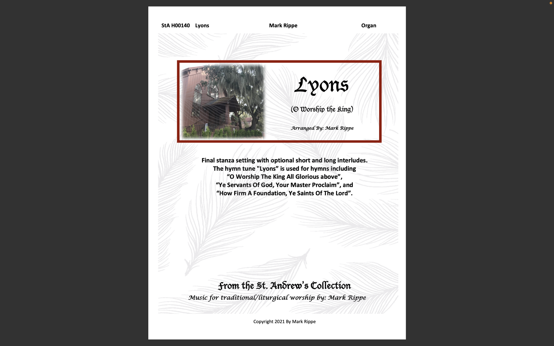 StA H00140. Final stanza setting with optional short and long interludes. The hymn tune “Lyons” is used for hymns including “O Worship The King All Glorious above”, “Ye Servants Of God, Your Master Proclaim”, and “How Firm A Foundation, Ye Saints Of The Lord”.