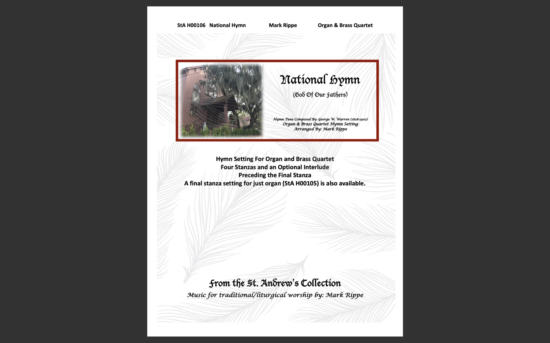 StA H00106. A hymn setting with four stanzas. Arranged for organ and brass quartet. An optional interlude prior to the final stanza is included. The hymn tune “National Hymn” is used for hymns including “God Of Our Fathers”. See also the hymn setting that is just a final stanza setting for organ only with optional interludes.